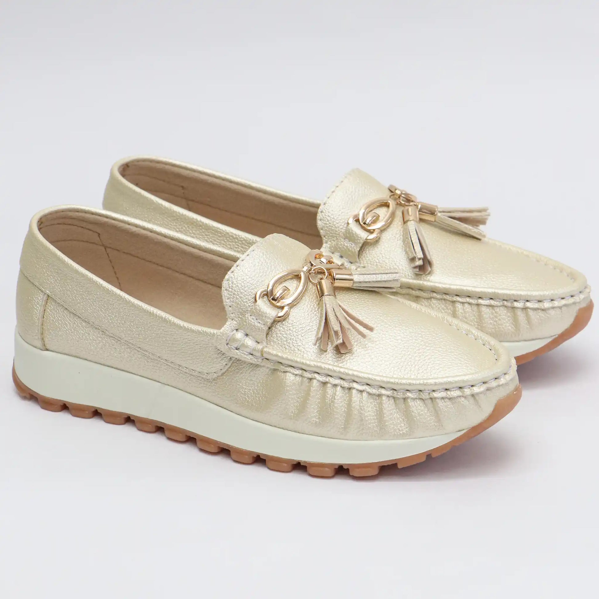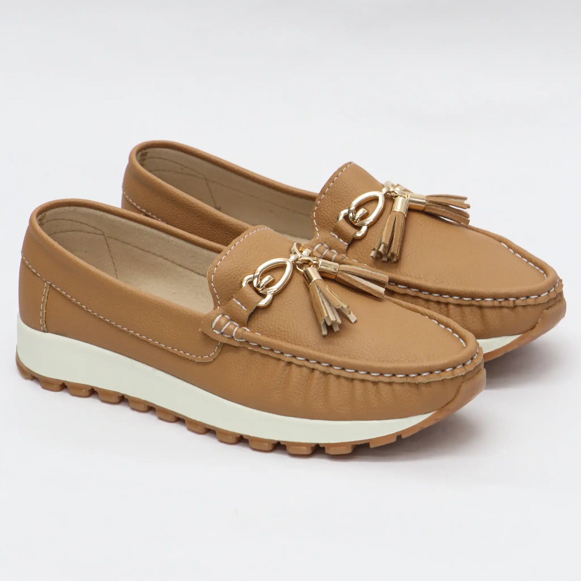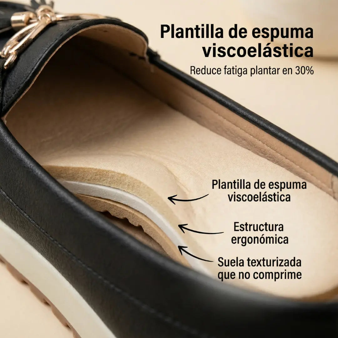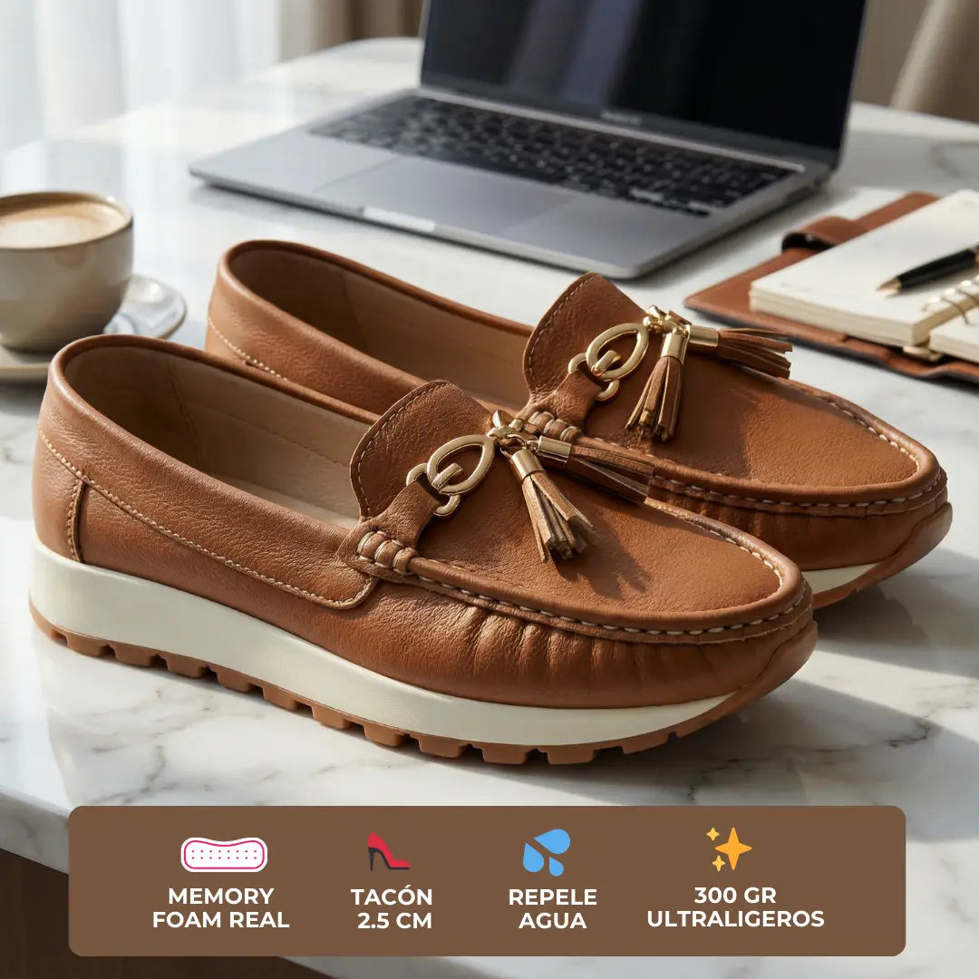 Diseño preppy con borlas que comunican sofisticación, pero construidos con tecnología de confort real: memory foam desde el primer uso, tacón de 2.5 cm que es la medida exacta recomendada por ortopedistas para descargar tu tendón de Aquiles, y solo 300 gramos de peso que no castigan tus piernas durante jornadas de 10 horas.